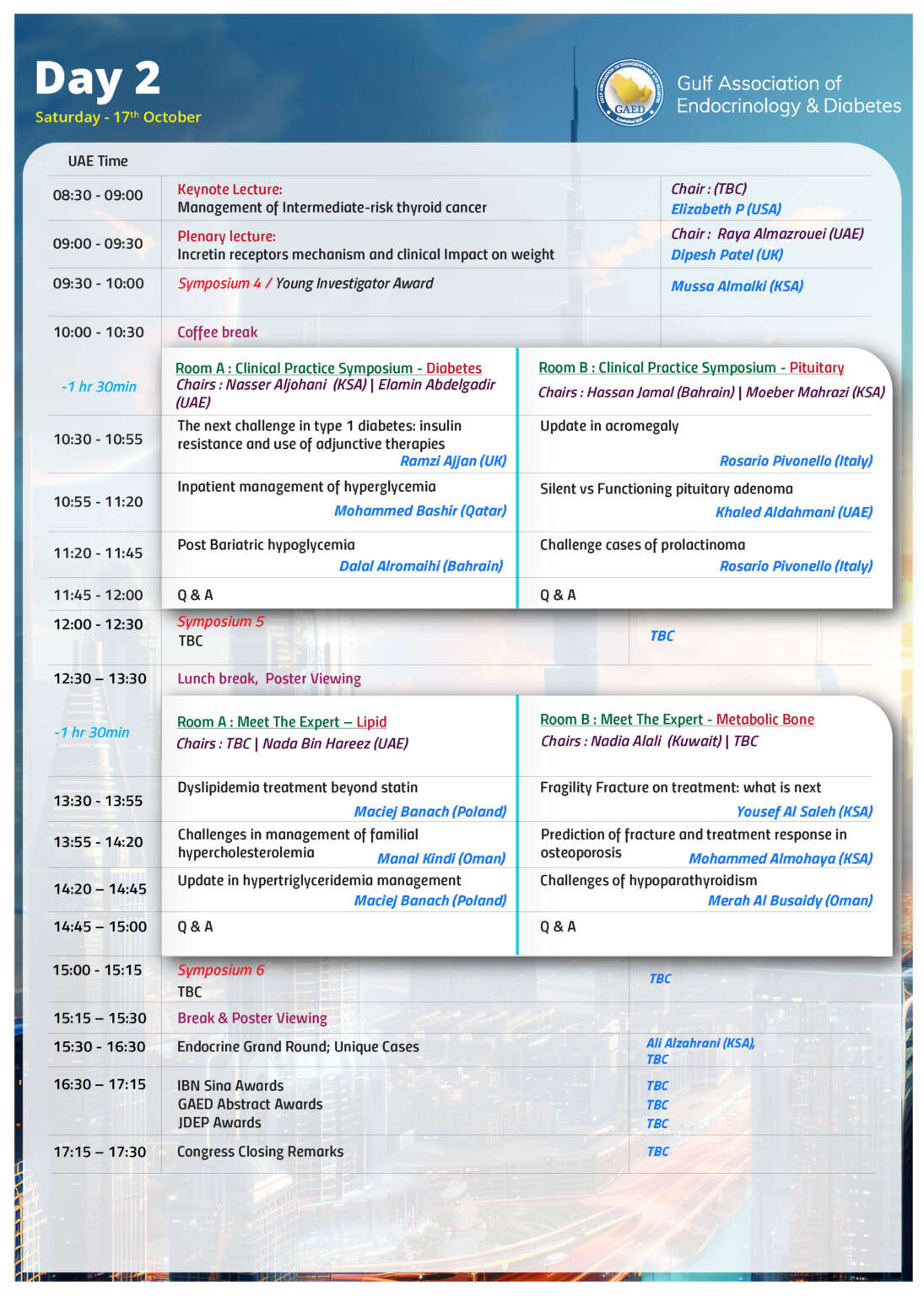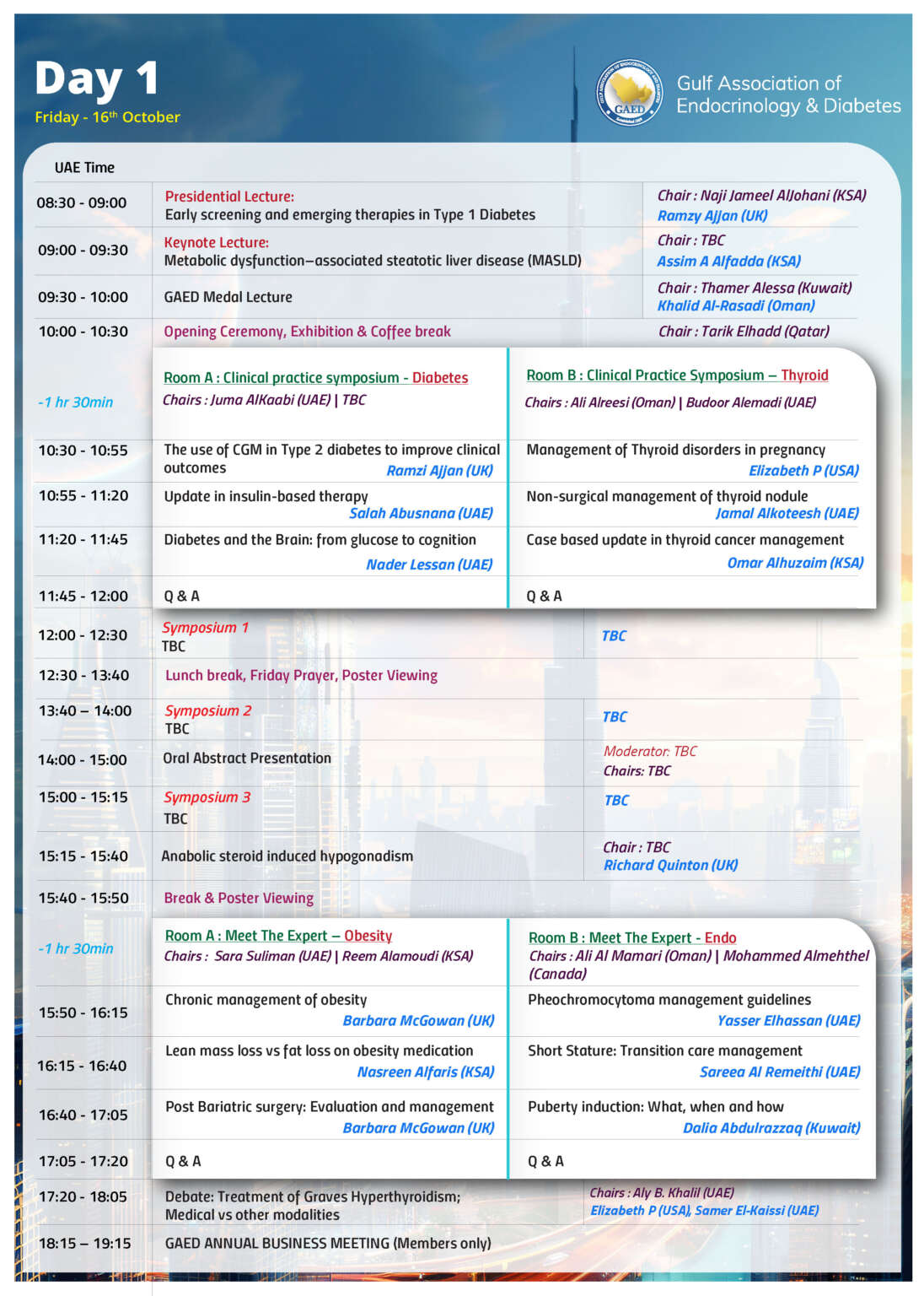 Following the remarkable success of last year’s conference, this year marks the 6th edition of the GAED Congress, fully organized under the Gulf Association of Endocrinology & Diabetes (GAED), the officially recognized regional body representing leaders in endocrinology and diabetes, previously active under the name AACE Gulf Chapter.